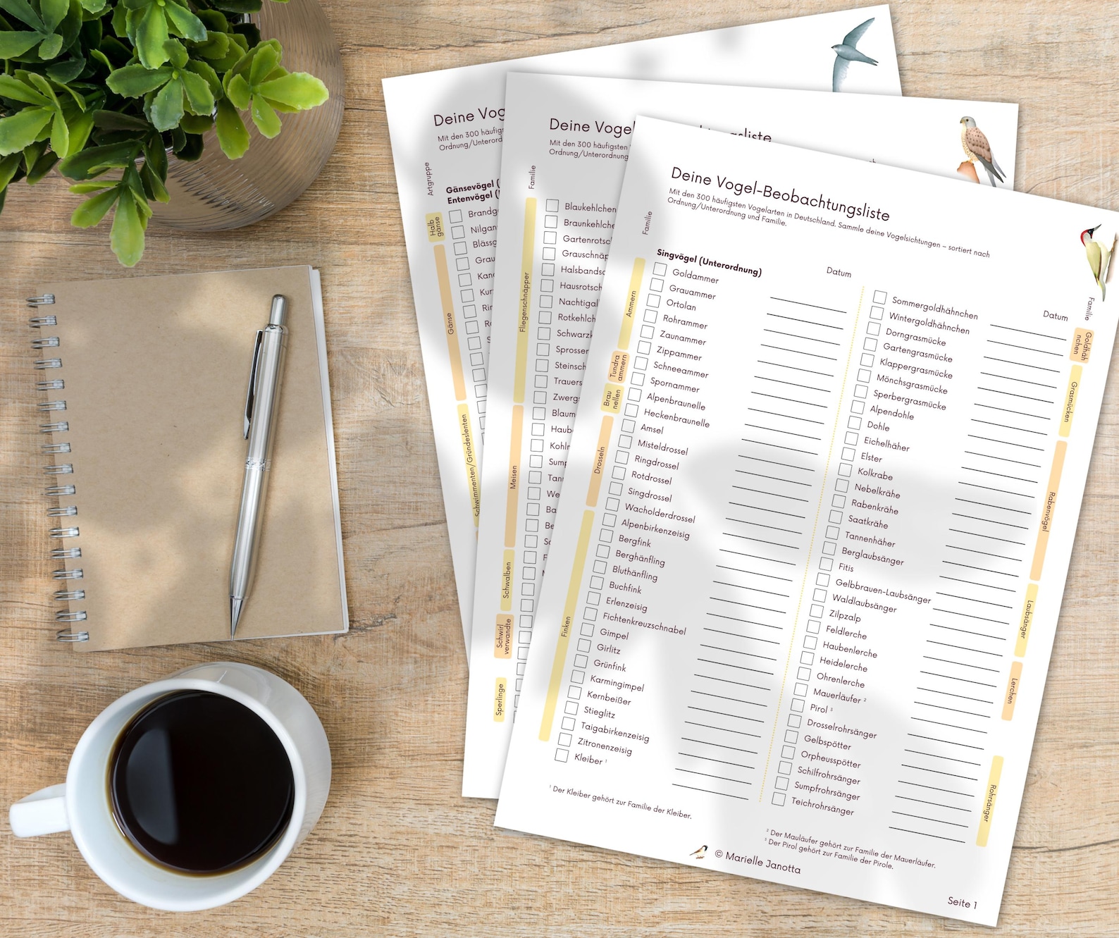 Entdecke die Welt der Vögel mit meiner übersichtlich gestalteten Vogel-Beobachtungsliste. Diese Liste umfasst die 300 häufigsten Vogelarten Deutschlands, sortiert nach Ordnung/Unterordnung und Familie. Egal, ob du bereits Erfahrungen in der Vogelbeobachtung gesammelt hast oder gerade erst mit diesem Hobby beginnst: Meine Liste ist eine super Hilfe, um deine Sichtungen festzuhalten und zu dokumentieren.