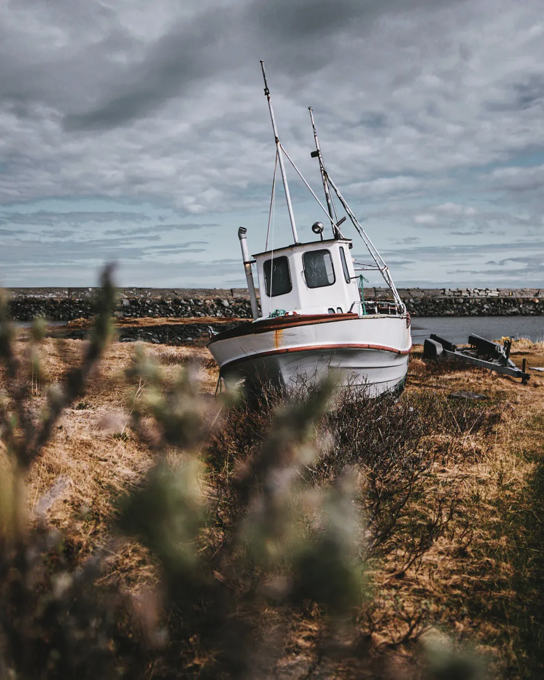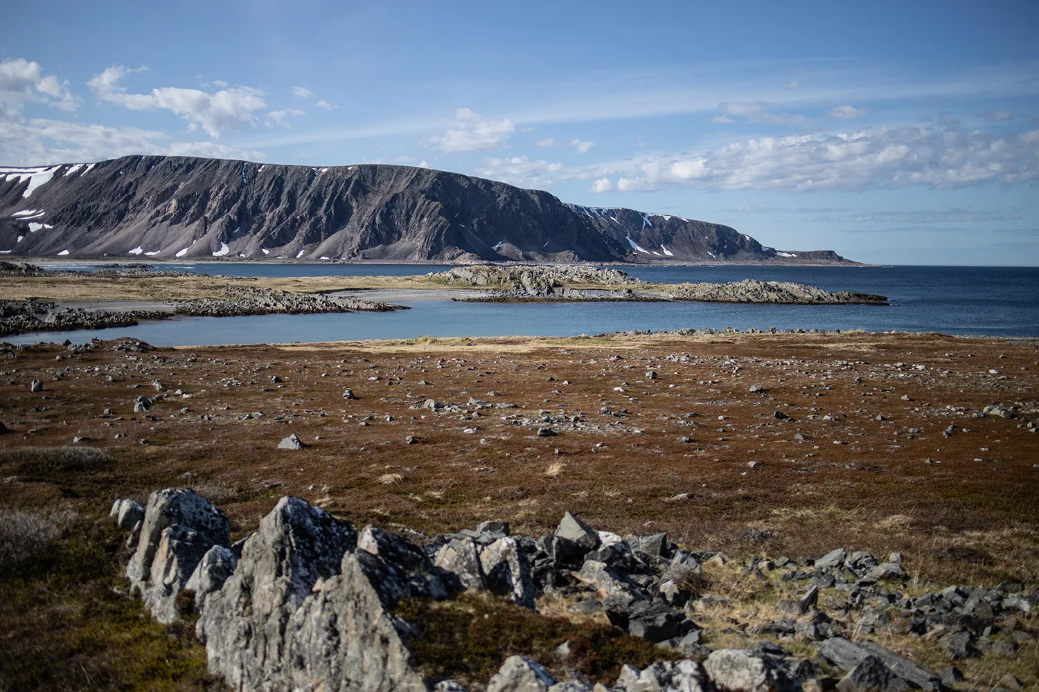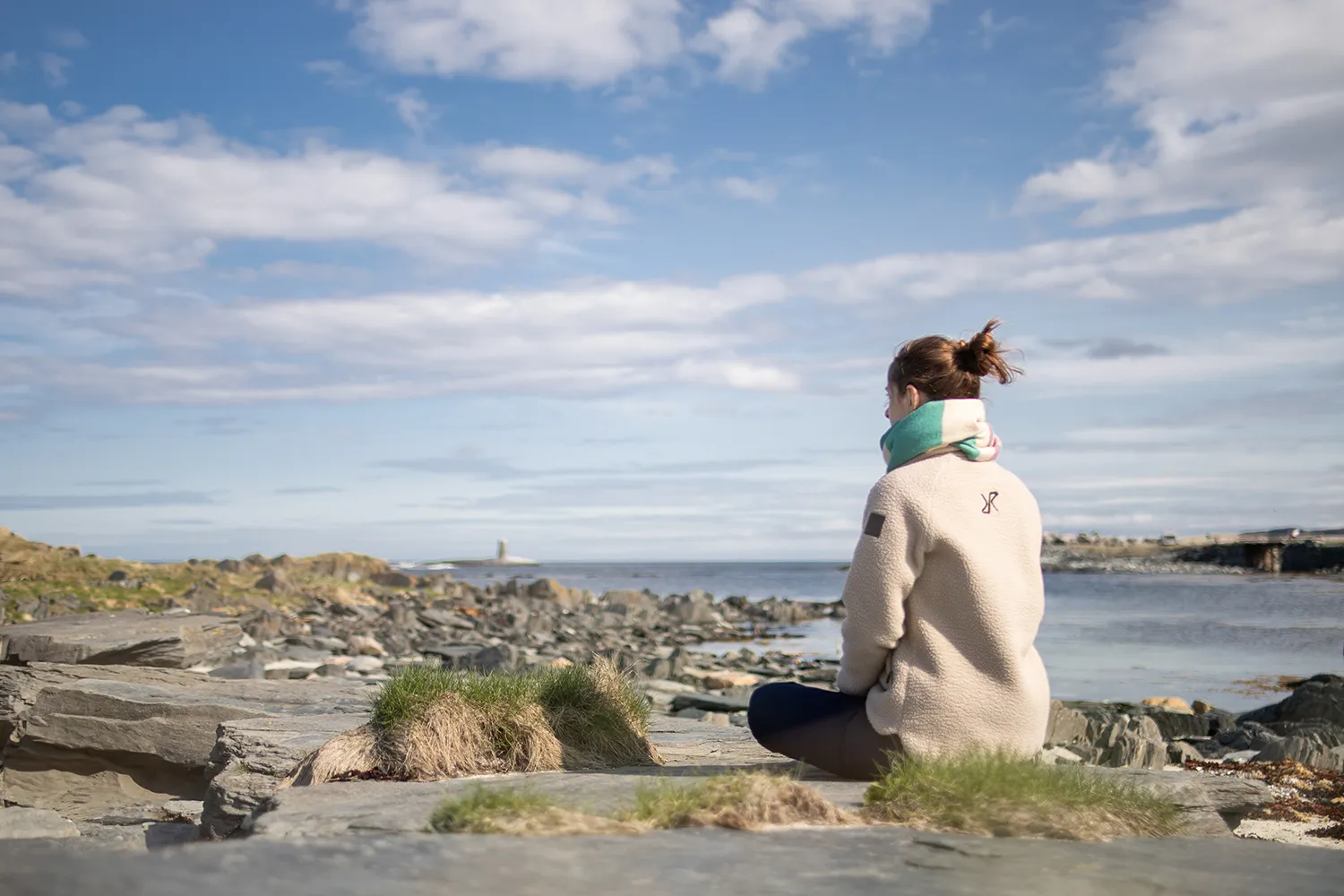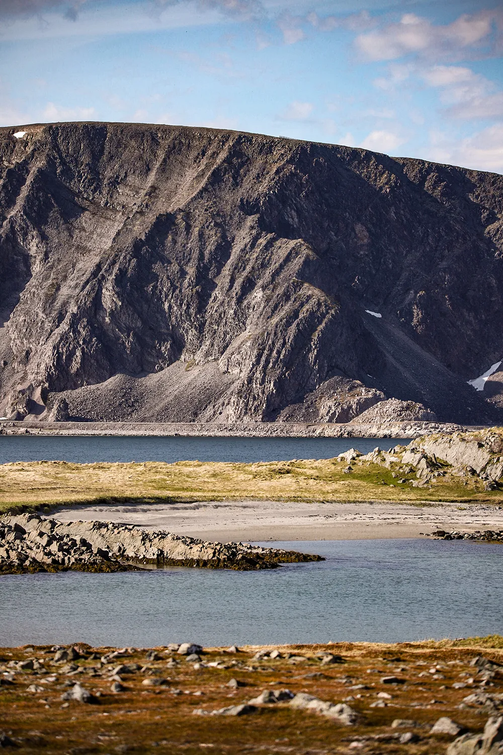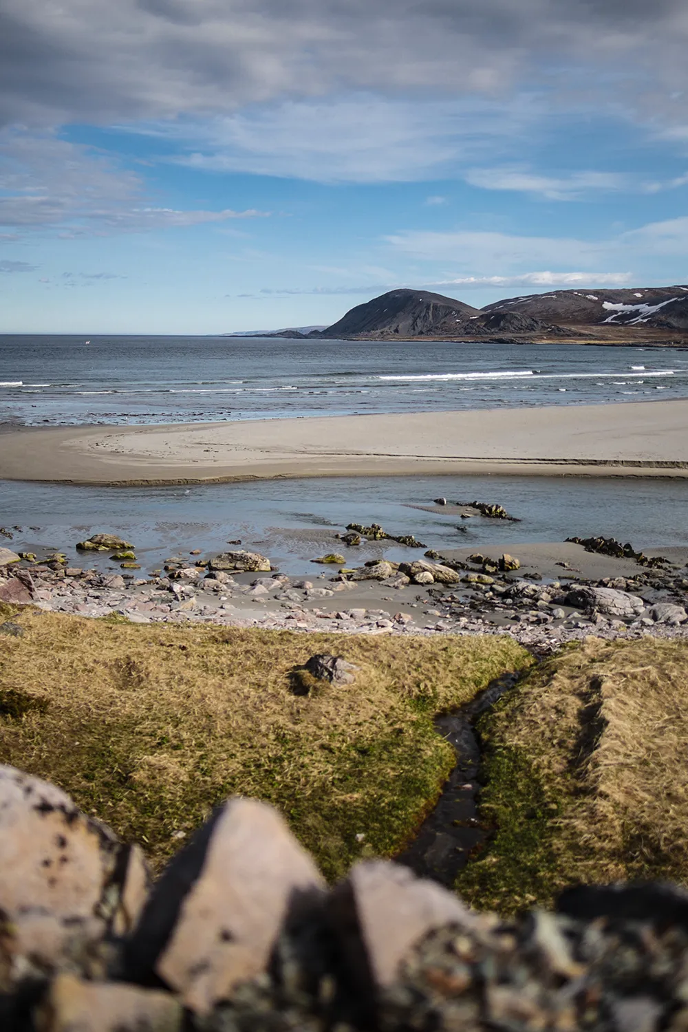 Wenn du in Berlevåg von der äußersten Hafenmole in Richtung Nordwesten spazierst, kannst du einem Trampelpfad folgen, der zu einem kleinen grauen Schuppen führt – vielleicht hörst oder siehst du aus der Ferne schon ein paar Schafe, die dort weiden. Dort angekommen, wirst du gleich die winzige Strandbucht entdecken, die sich hier zwischen angespühlten Felsbrocken und vorgelagerten Schäreninselchen verbirgt. Diesen Ort hatte ich im Frühling ganz für mich alleine, um die ersten warmen Sonnenstrahlen zu fühlen und dem sanften Plätschern der Eismeerwellen zu lauschen. Während diese an der Hafenmole mit solcher Gewalt an die Tetrapoden krachen, dass das Wasser riesige Fontänen in die Luft sprüht, ist die Strandbucht so gut geschützt, dass man sich beim leisen Gluckern an die Malediven träumen kann.