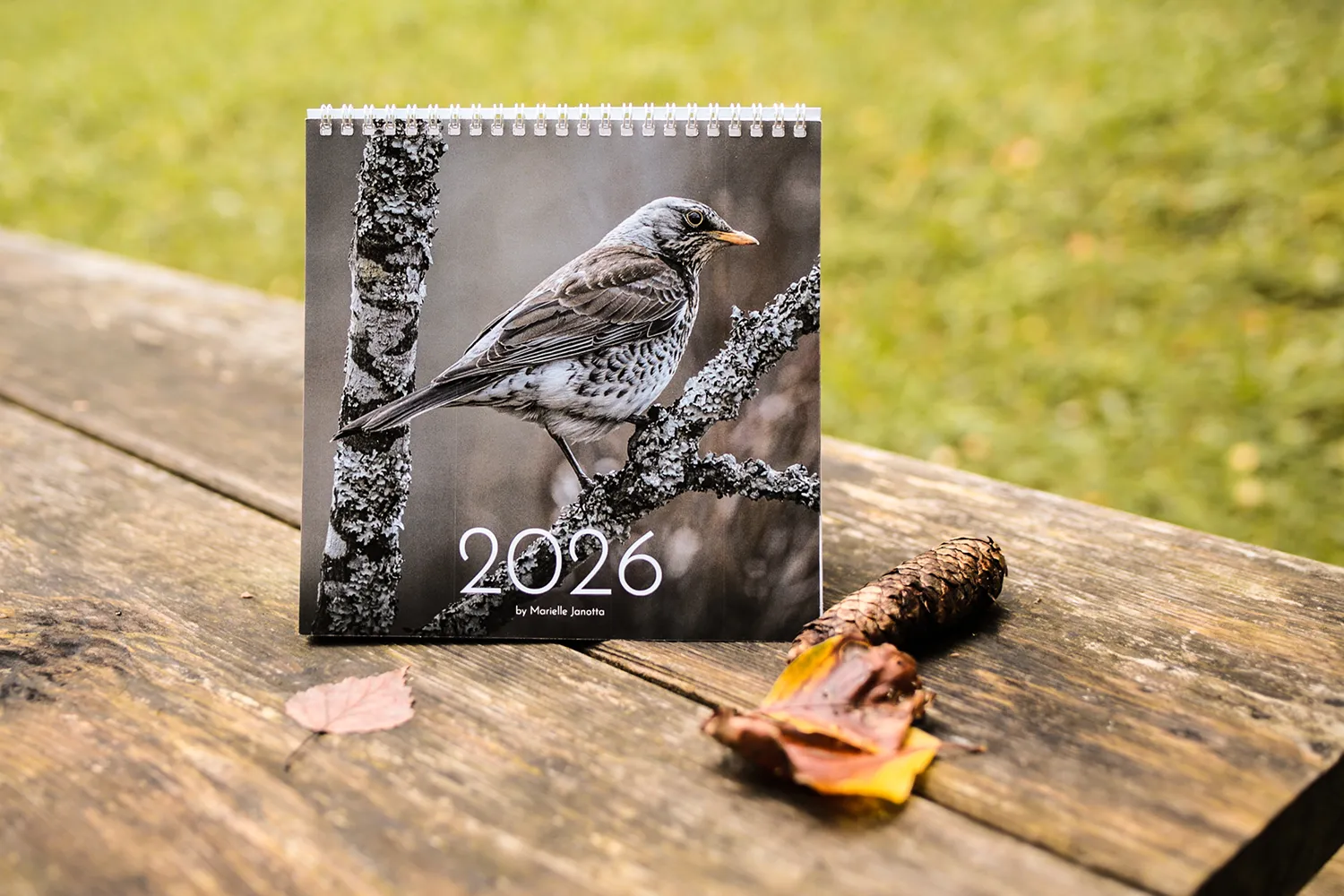 Darf ich vorstellen: Mein Tischkalender 2026 – Vögel | 20×20 cm | beidseitig bedruckt, umweltfreundlich & mit meinen eigenen Vogelfotografien.
